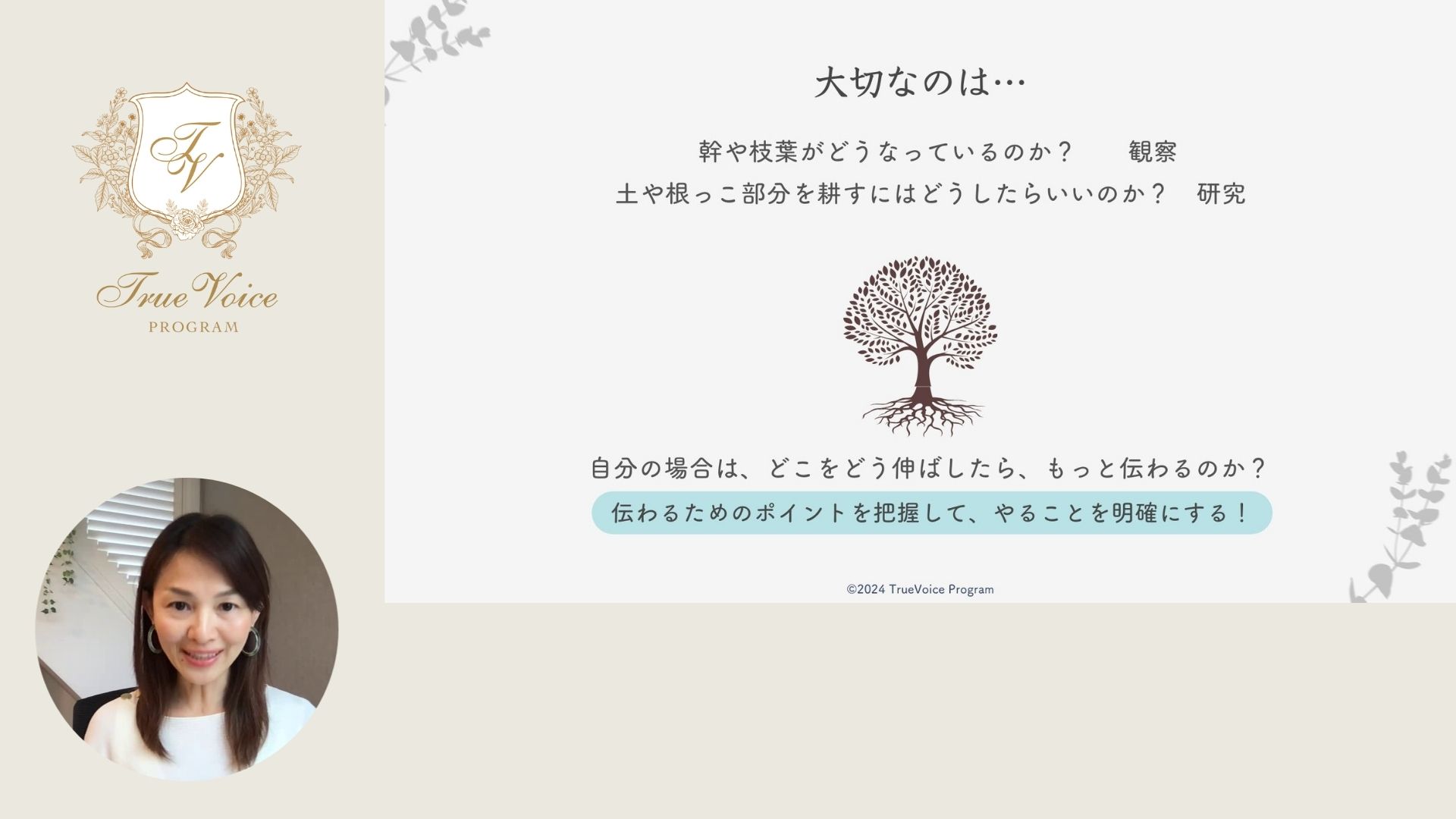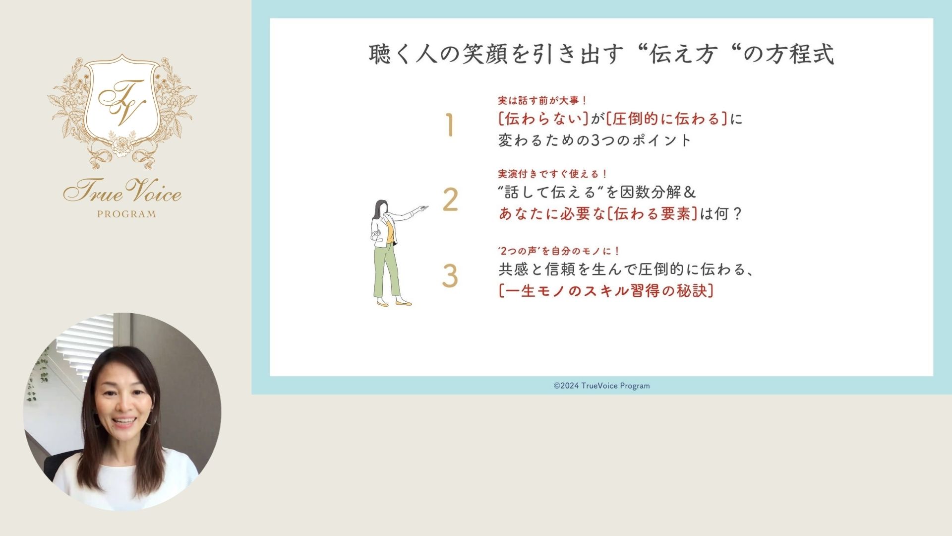 話し方・伝え方に関する情報は、世の中に本当に多くあふれています。ただ私自身は、発声方法や伝え方のテクニックだけでは伝わらない…という苦い経験をしました。そして、もう一つの大切な要素を土台に据えたことで、伝わり方や周囲の反応が圧倒的に変わった経験から少しでも多くの方に、今抱えるお悩みの解決方法があること、いつからでも身につけられる可能性を感じていただきたく、今回の動画プログラムにまとめて無料で公開することにしました。